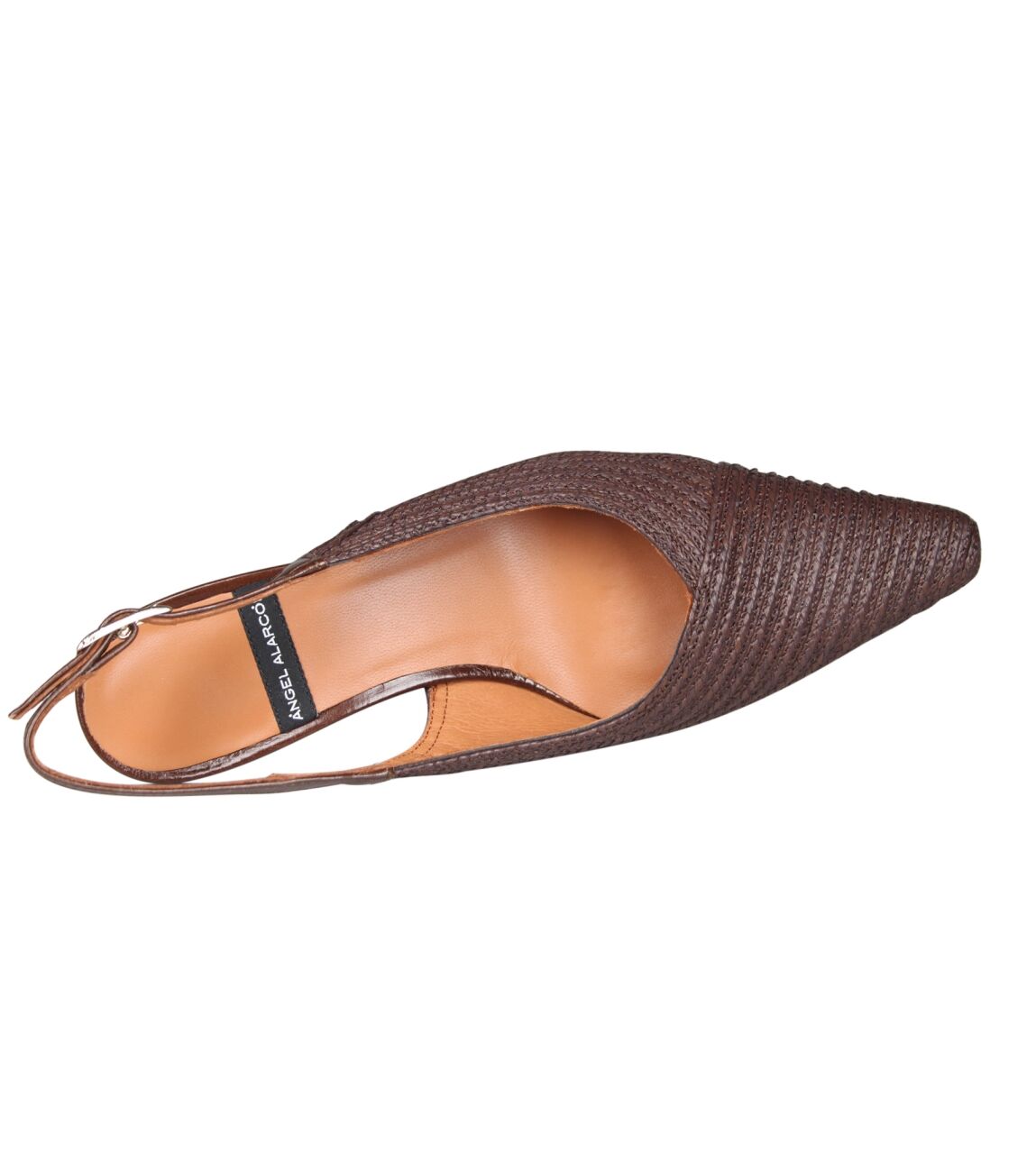 De OLIVIA 26020-416D slingback van Angel Alarcon in cordela testa greta cafe is gemaakt van raffia.