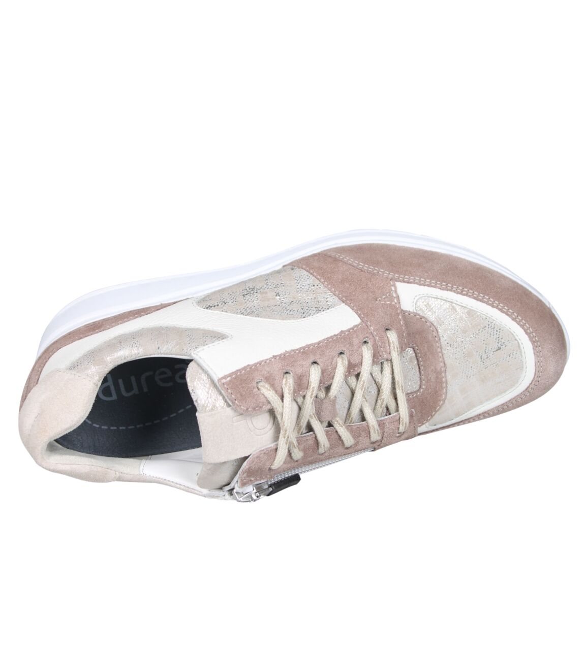 De 6315.2166 sneaker van Durea in wijdte H in charme/wit/l.taupe/avorio is gemaakt van suede/metallic en geschikt voor bredere voeten.