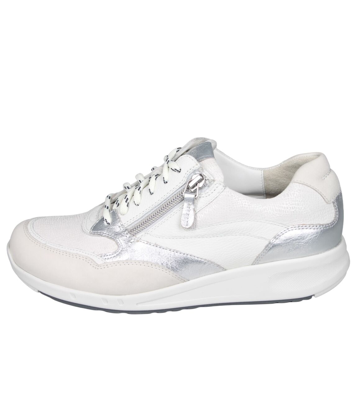 De 6306.1670 sneaker van Durea Go in wijdte K in ivoor/wit/mat zilver is gemaakt van nubuck/metallic en geschikt voor extra brede voeten.
