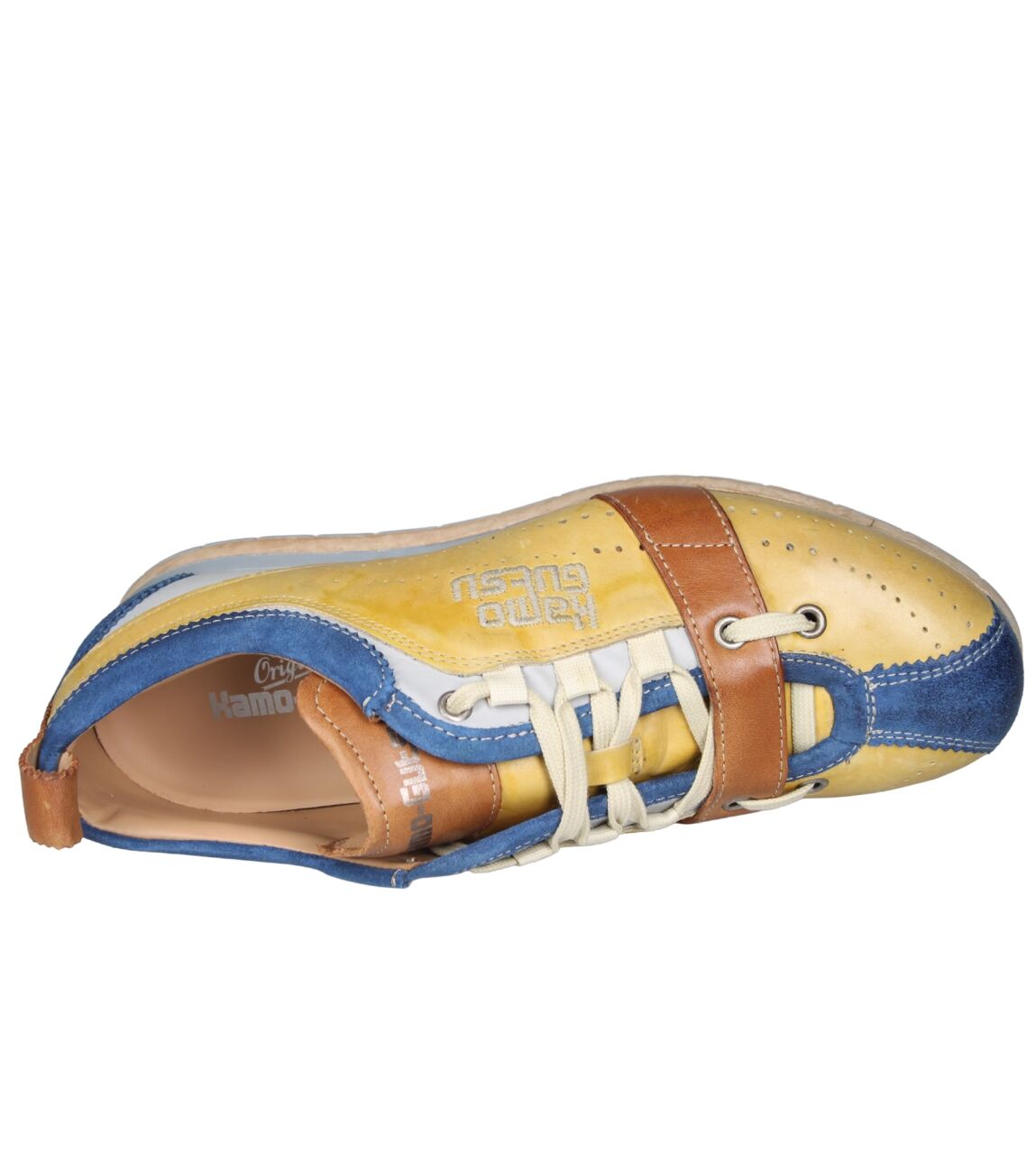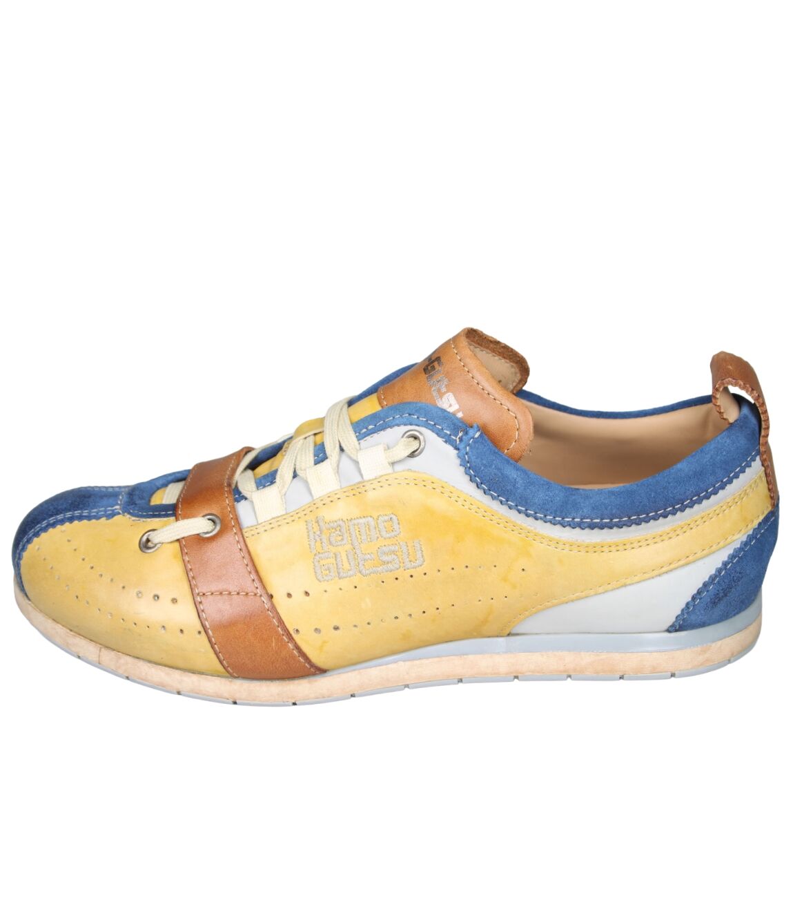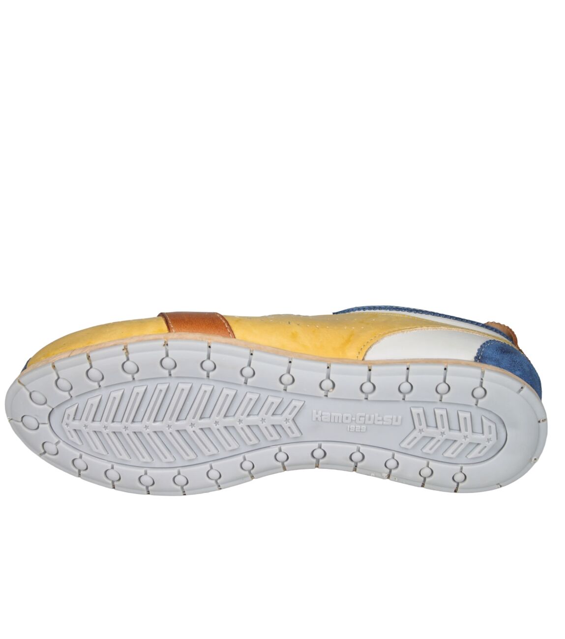 De TIFO-017 sneaker van Kamo-Gutsu in cobalto + ochre is gemaakt van leer/suede.