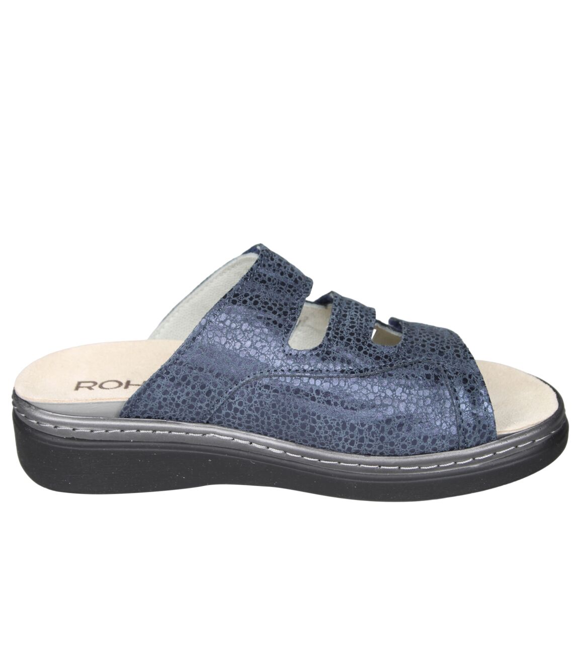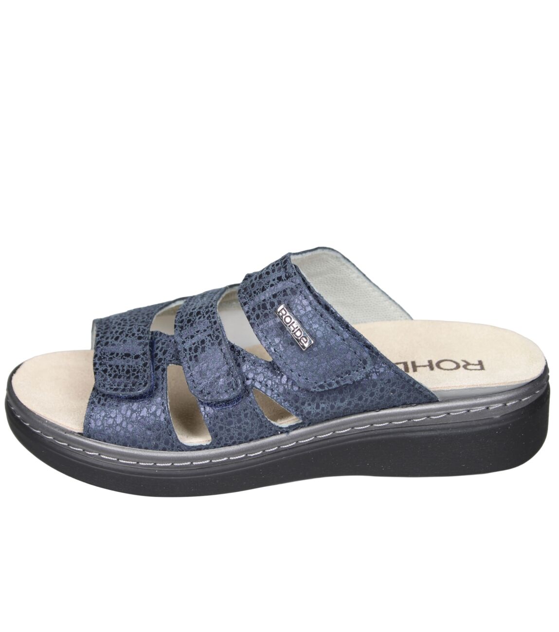 De 5221 slipper van Rohde in wijdte G in 56 ocean is gemaakt van stretch metallic en geschikt voor gemiddelde voeten.